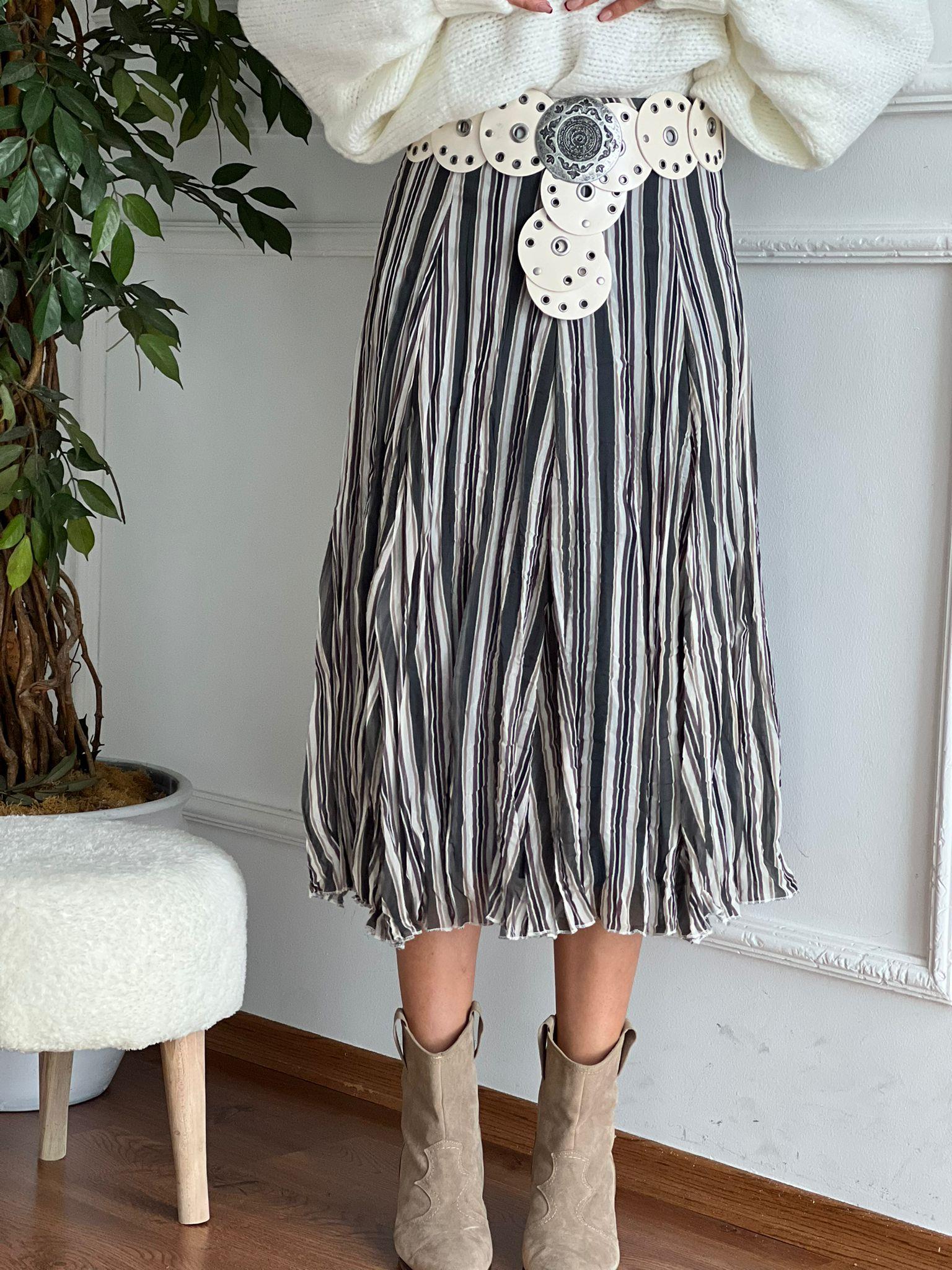 Çizgili Midi Etek 26-2209 Ekru