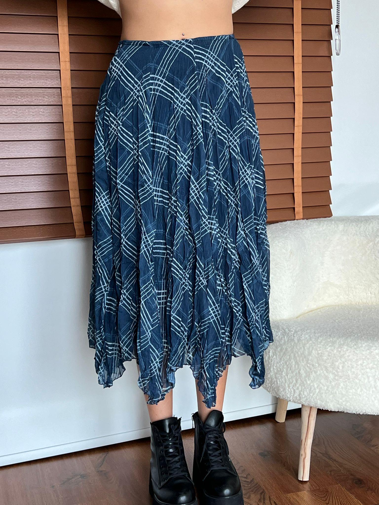 Ekose Desenli Asimetrik Etek 26-2210 Petrol Mavisi
