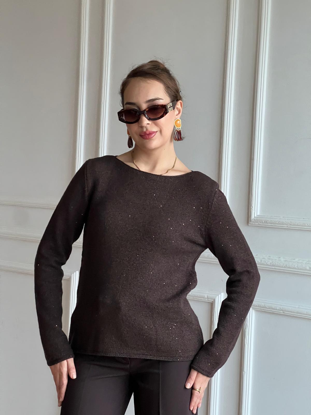 Kayık Yaka Pullu Simli Triko Kazak 10836 Kahverengi (004000197 002)