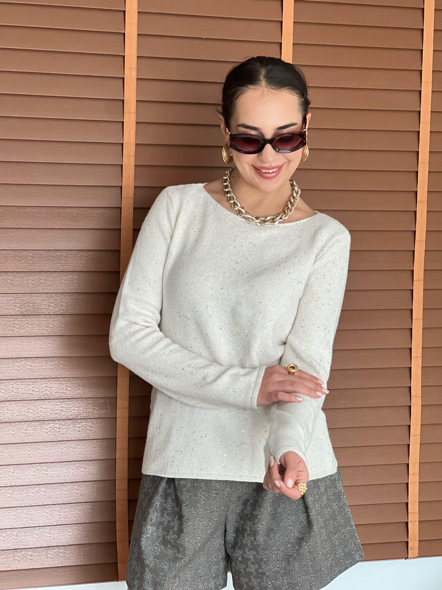 Kayık Yaka Pullu Simli Triko Kazak 10836 Krem (004000197 028)