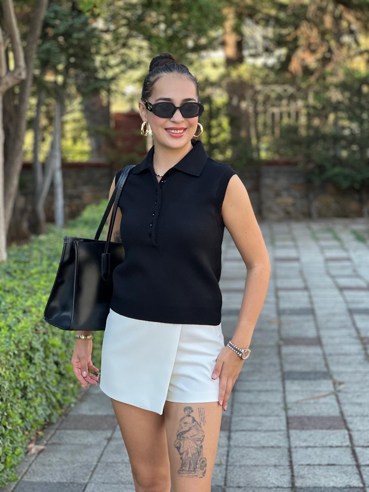 Polo Yaka Düğmeli Kolsuz Triko 251105 Siyah