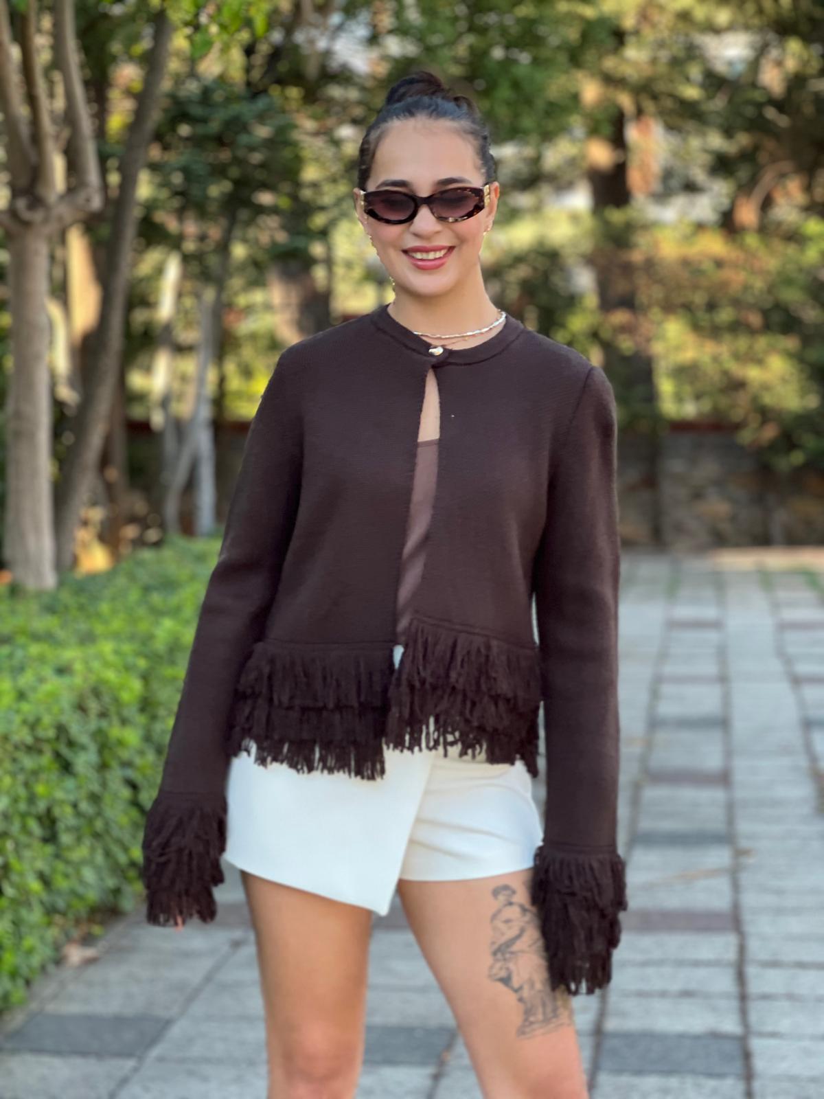 Püsküllü Düğmeli Triko Hırka 60993 Kahverengi (005000152 002)