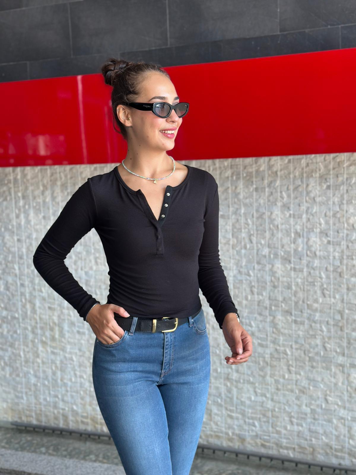 Uzun Kollu Çıtçıt Düğmeli Bluz 31442 Siyah (001000155 001M)