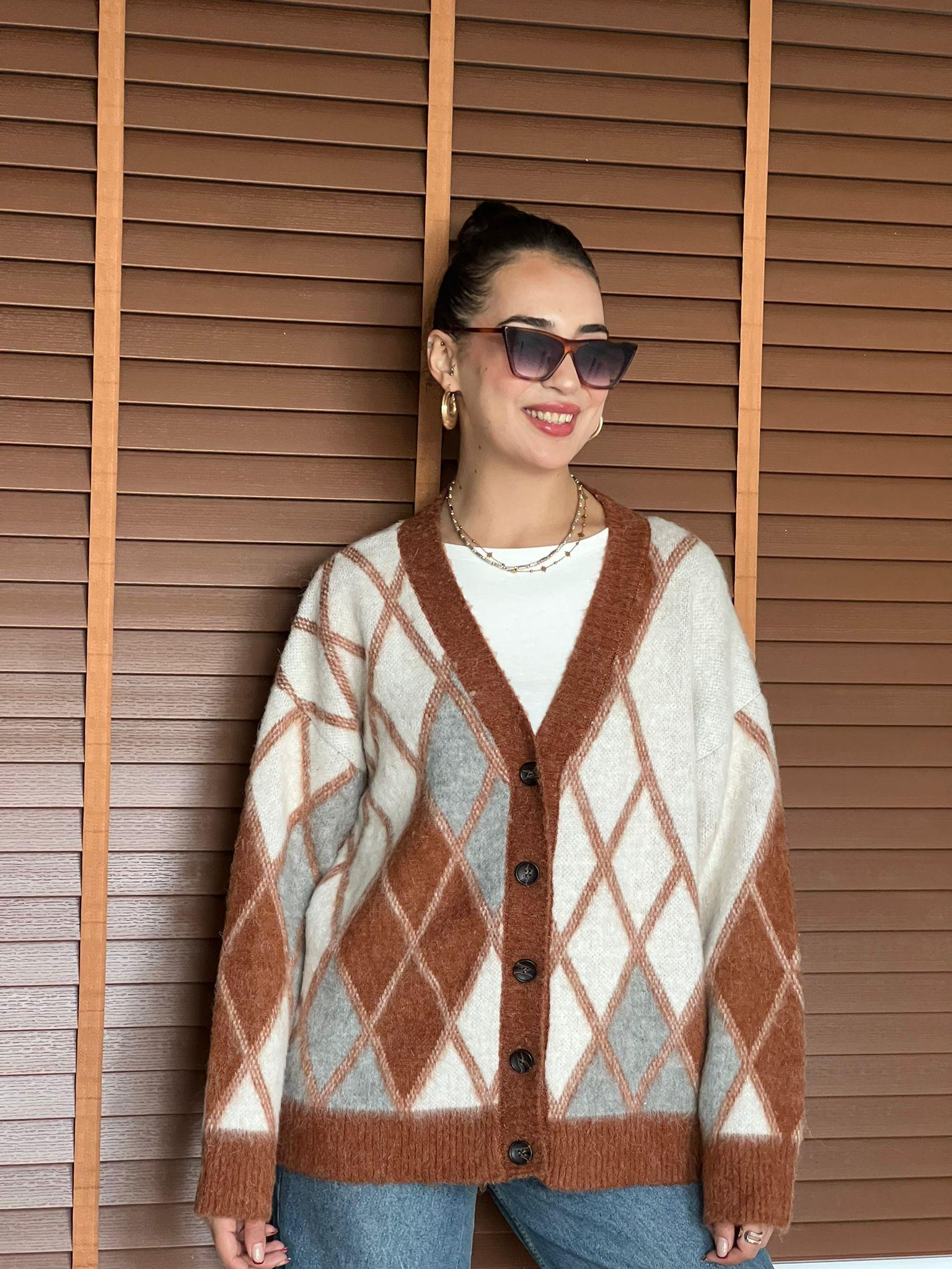 V Yaka Baklava Desenli Şardonlu Hırka Karamel