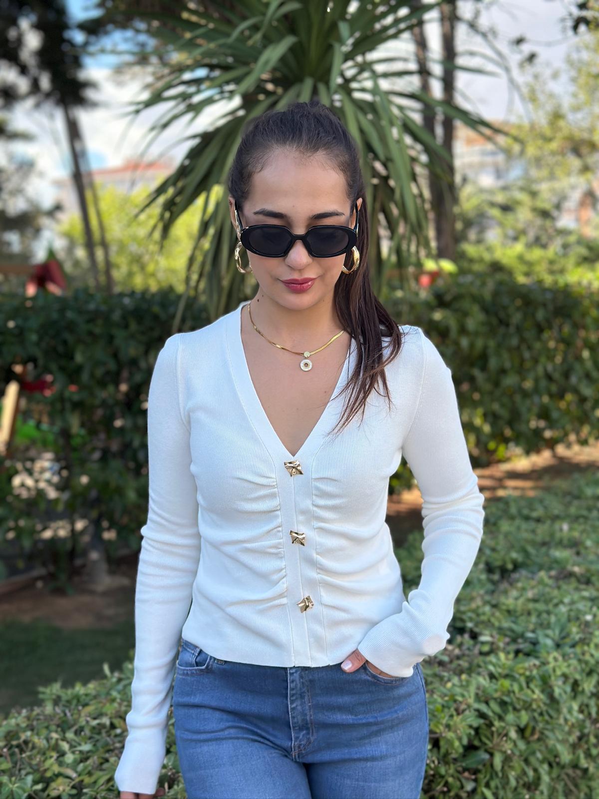 V Yaka Düğmeli Triko Bluz 10805 Ekru (001000179 026)